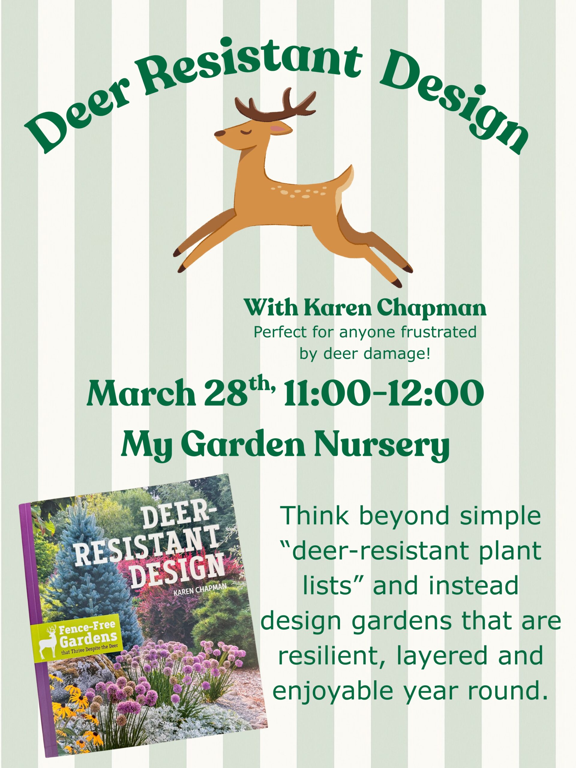 If deer have been a challenge in your yard, don’t miss the Deer Resistant Design Seminar with author and garden designer, Karen Chapman, THIS SATURDAY! She shares practical ways to create gardens that are colorful and welcoming to you, but far less tempting to deer. You can use smart plant choices and thoughtful design.